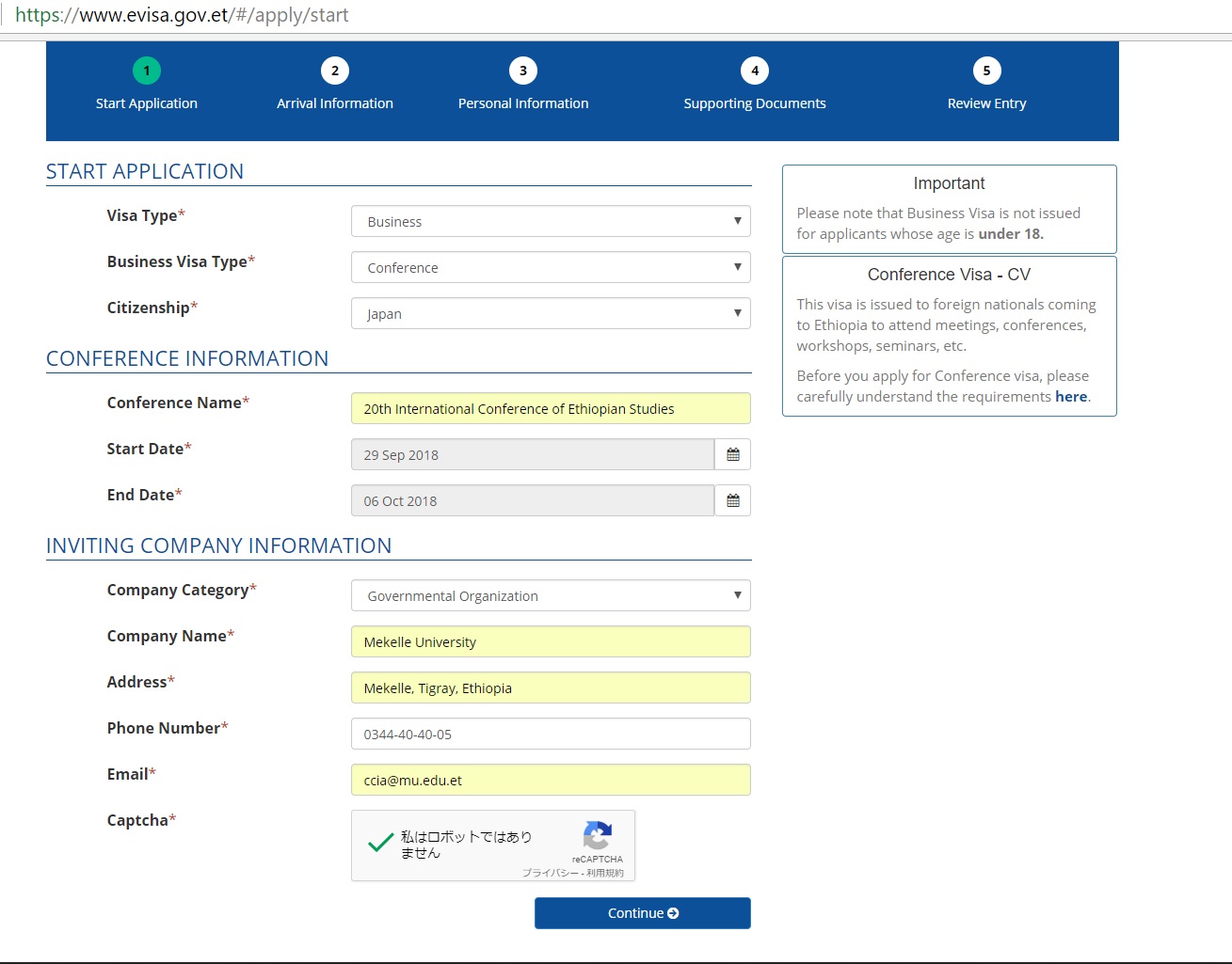- e-Visa Start Application SAMPLE (1st page: Conference and Inviting Company information)