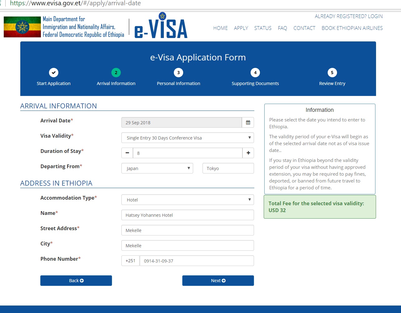 For your reference: following are the EXAMPLE inputs of the first two pages of the e-VISA application. (Please change the information such as Citizenship (page 1), Arrival Date (page 2), Duration of Stay (page 2), City of Departure ("Departing From") (page 2), and the Hotel information (page 2) according to your situation.)